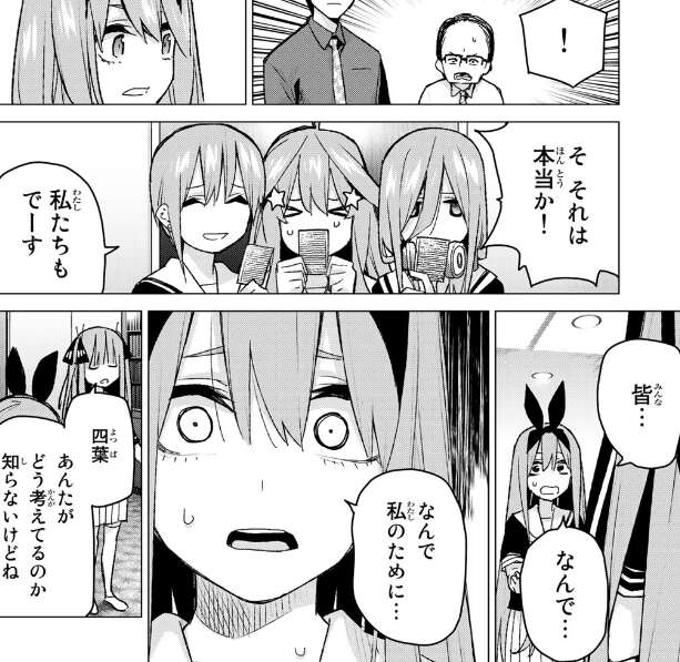 父親から試験を通過したはずだから転校する必要はないと言われますが、二乃はカンニングしたおかげで試験に通過できたと言い、一花、三玖、五月も同じくカンニングペーパーを見せて自分達もだと言います。四葉はなんで私のためにと驚きますが、四人はどこに行くにしてもみんな一緒がお母さんの教えだと言い、私たちは五等分だから困難も五人でなら乗り越えられるよ、と三玖は四葉に優しく言います。