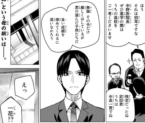 五つ子たちは中学生になり、五人全員黒薔薇女子に通っています。五つ子の父親が、パーティーのような席で黒薔薇女子の理事長と、武田の父親との会話で黒薔薇女子が中高一貫の学校であることが語られています。