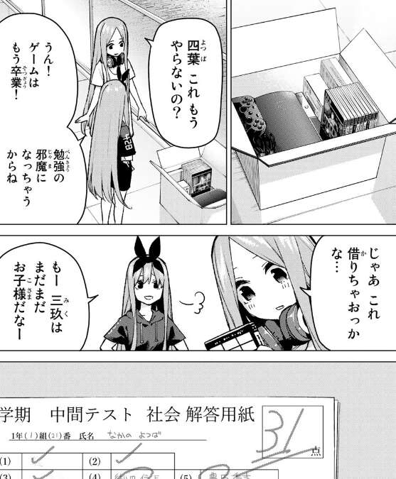 四葉はテストでも五人の中で一番だったと、父親に報告しますが父親はどこか冷たくこれからも勉強を励むようにと言うだけで、四葉は不満げです。四葉は勉強を優先するために、ゲーム機やゲームソフトも片付けてますが、それを見た三玖がゲーム一式を借りちゃおうと言います。四葉はそんな三玖をお子様扱いしています。