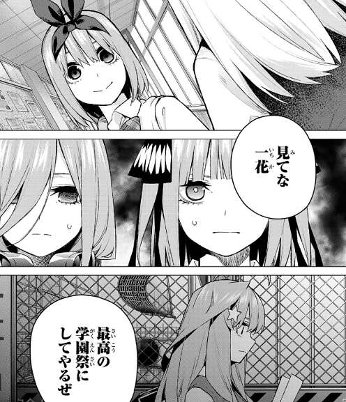 五つ子たちは2年の時は転入してすぐだったので、3年の今回は準備にも参加できてうれしそうです。これで大学の入試判定の結果が返ってこなければと、二乃は愚痴を言い風太郎と同じ大学に行く妄想をしますが、即座に否定されます。そして学園祭が終われば、いよいよ本格的に受験に突入かと呟きます。
