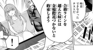 目標は5人の卒業です。馬鹿正直に全員相手にする必要がない事に気づいた風太郎は、テストで合格ラインを超えれば近づかないと提案します。