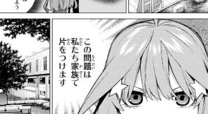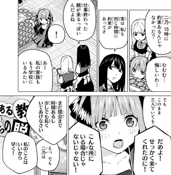 前回、学園祭に向けてクラスで屋台のメニューを話しあっていましたが、たこ焼きとパンケーキ、どちらがいいかで女子組、男子組で対立が起き、二乃と三玖は対立に巻き込まれてしまいます。学級長の風太郎はなかなかメニューが一つに絞れない状況に困っていますが、話し合いは平行線で決まりそうにありません。