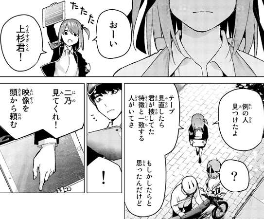 なかなか来ない父親に二乃は反発し、バイクで来た風太郎には父親の所には行かないと言います。しかし風太郎は、俺に対して五つ子たちの父親はめちゃくちゃ怖ぇーぞ…、と言いあんなのお前たちへの愛情がないと出来ないと言います。そこに放送部の椿が五つ子たちの父親が学園祭に来ている映像を見つけ、二乃に見せてくれます。