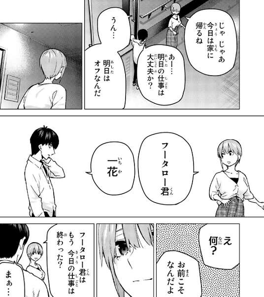 またも一花はドラマの撮影をしていますが、今度は学園祭の二日目に一花の妹が倒れたと連絡が入ります。一花は慌てて病院に確認に行きますが、倒れた妹(誰かはこの時は不明)元気なようで一花は少し安心します。部屋を出たところで、二乃と風太郎に会いますが、二乃は学園祭の片づけがあるようで、学校に戻り一花と風太郎が残されます。残された二人は今日の仕事は終わったという事で、少し歩こうと二人で散歩し始めます。
