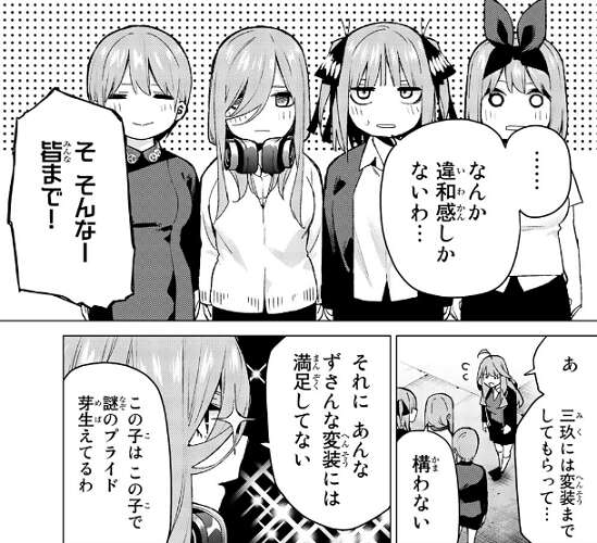 五人それぞれの学園祭を終えて後は後夜祭のみとなり、五つ子全員が集まっています。五月は無堂の件で手伝ってくれた四人にお礼を言いますが、敬語を辞めた五月には違和感しかないと二乃に言われてしまいます。その後、「私たちはいつまで五つ子なんだろう」という意見も出ますが、今は後夜祭を楽しもうと五つ子たち全員の行きたいとこを順番に回る事にします。