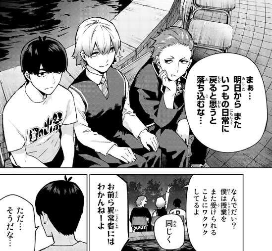 前回、五つ子たち全員が学園祭の全てが終わる頃各々の部屋で、風太郎を待つことにしましたが、風太郎は前田、武田と一緒に池の前でクラスの誰かが他のクラスの子と付き合いだした、というような話をしています。そんな話をしながら学園祭が終わってしまう寂しさを感じていると、せっかくだからいつまでもこんなところに座っていないで屋台に食いに行こうと前田が言います。風太郎も行けずじまいの店があったと賛成し、その後は会う約束をしている奴がいると話します。