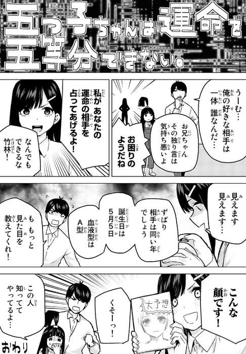 風太郎が気持ちの悪い独り言を話している、とらいはにツッコまれていると、なんでもできる竹林が風太郎の悩みを解決しに現れます。風太郎の運命の相手を占ってくれますが、誕生日と血液型と見た目では、結局誰か分かりませんでした。