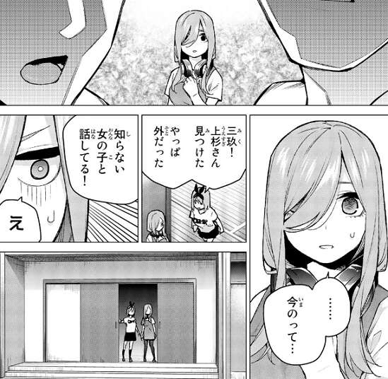 クラスの男子 たこ焼き組を説得してクラスの女子たちとの仲を修復する事に成功しかけますが、男子がやっているたこ焼き屋からボヤが発生してしまいます。クラスの女子たちの印象も悪くなってしまい、クラスの皆を説得して仲直りしてもらう事は再び難しくなってしまいます。その時、体育館でクラスの男子が話していた会話の内容に三玖は驚きますが、四葉から風太郎が知らない女の子(竹林)と話をしていると聞いてさらに驚きます。