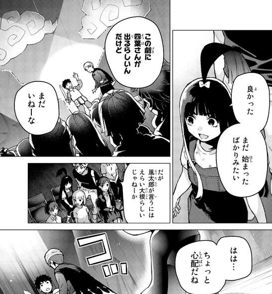 今回は学園祭 後夜祭が終わり、全てのスケジュールが終了したアナウンスを聞いている四葉の描写から始まります。その後は時間が巻き戻り、四葉は学級長の仕事をこなしつつ、さらに演劇部のお手伝いも掛け持ちしています。そして、四葉は園祭当日の劇にまで出演していて、風太郎は大根役者と心配していましたが四葉の演技は好評で、らいはもかっこいいと褒めています。