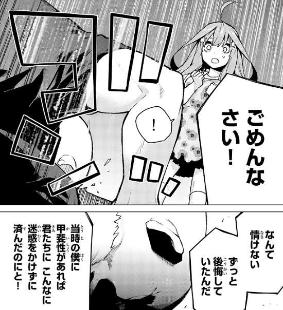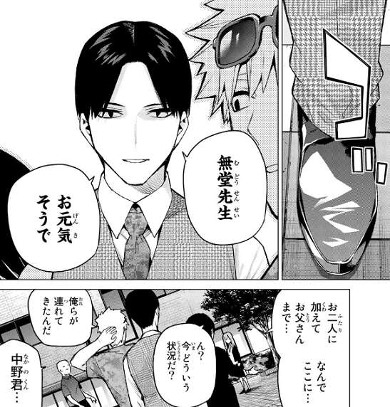 無堂は五月に自分が実の父親だと告白し、ずっと会いたいと想いながら講師として全国を回っている時、テレビに映る一花を見つけたと言います。五月はお腹の中にいる子供が五つ子だとわかった途端、姿を消した事を責めますが、無堂は土下座をして五月に謝罪します。そして、無堂は今からでも父親として娘にできることをしたいと、罪滅ぼしをさせてほしいと言います。