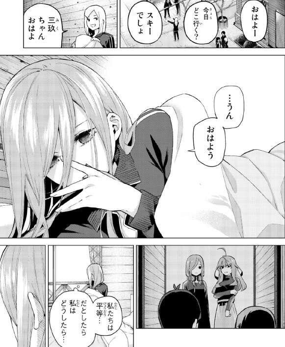 何とか閉じ込められていた倉庫から脱出できた風太郎と一花ですが、体調を崩してしまいます。三玖は相変わらず姉妹で平等にこだわっています。一花は五月が看病していますが、風太郎は一花の体調は大丈夫だと思い込みゲレンデで三玖、四葉と滑ります。
