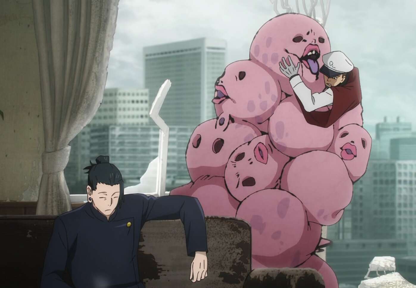 Qの戦闘員コクーンは、夏油の呪霊操術にあっさりやられてしまい捕らわれてしまいます。コクーンはQの最高戦力バイエルに期待しますがバイエルも五条にあっさりやられていて、Qは組織として瓦解し天内は無事保護されます。