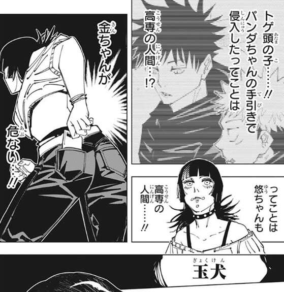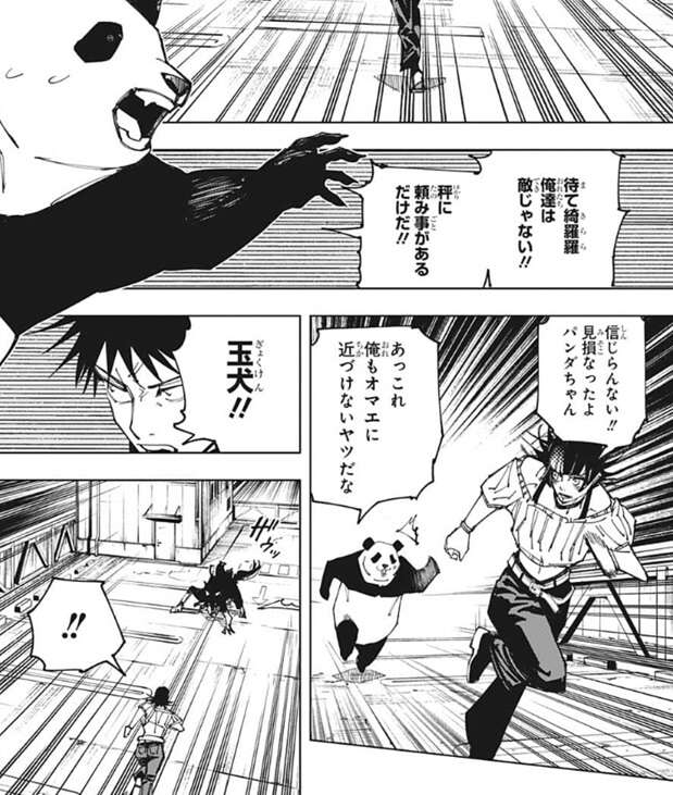 星綺羅羅がモニタールームの方に走っていくのを見たパンダは、自分たちは敵じゃない、秤に頼み事があるだけ、と叫び星綺羅羅の誤解を解こうとします。しかし星綺羅羅はパンダの言う事を聞こうとせず、モニタールームの方に走っていきます。パンダも星綺羅羅を追いかけますが、術式によって星綺羅羅にも近づけないようになっているようです。伏黒は玉犬を使ってモニタールームのドアを塞ぎ、秤の所に行けないように星綺羅羅の邪魔をします。
