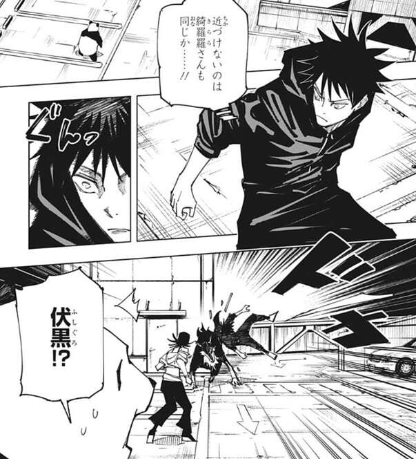 しかし、玉犬が星綺羅羅に接触する直前、玉犬が伏黒の方に吹っ飛ばされたような形で伏黒と衝突します。伏黒はパンダの話を思い出し、玉犬は吹っ飛ばされたのではなく、星綺羅羅の術式のせいで近づけなかったのだと推測します。