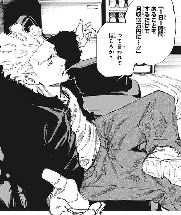 一方、モニタールームの中で秤に会うことが出来た虎杖ですが、秤から質問を受けています。1日1時間あることをするだけで月収100万円に…!!って言われて信じるか、と胡散臭い言葉を信じるかと秤に質問され、虎杖が困惑している場面で今回は終わります。