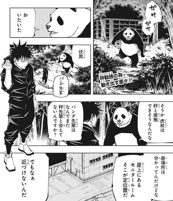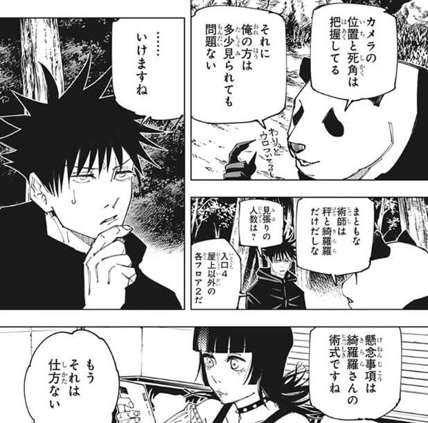しかし、パンダは防犯カメラの位置と死角は把握しているそうで、さらにパンダはウロついていても多少は問題ないようで、パンダは平気だと言います。まともな術師は秤と星綺羅羅だけのようで、見張りの人数も入り口に4人、屋上以外の各フロアに2人だとパンダは言い、それを聞いた伏黒も行けそうだと判断します。懸念事項は星綺羅羅の術式ですが、もしワープのような術式で虎杖を出したり仲間を入れたりできる場合は、秤の説得を諦めようとパンダは言います。