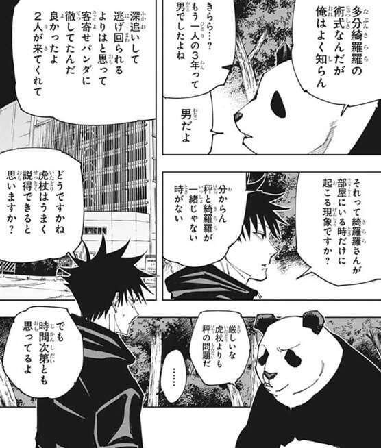 パンダは星綺羅羅の術式のせいと推測しますが、パンダも星綺羅羅の術式を知らないそうです。ちなみに星綺羅羅は男です。パンダは深追いして秤に逃げられるよりは、客寄せパンダに徹して秤と会える機会を窺っていたようです。虎杖が秤を上手く説得できるか伏黒は心配しますが、虎杖よりは秤の問題で厳しいとパンダは考えています。しかし、虎杖の根明で人たらしな性格と秤は相性がいいとパンダは考えているようで、虎杖が秤と話す時間を稼ぐため、モニタールームのドアの前を固めようとパンダは伏黒に提案します。秤の仲間がモニタールームに割って入って、虎杖が話をするのを邪魔されないようにするために、秤の仲間を眠らせておくつもりの様ですが、伏黒はあまり手荒なことをしてバレて秤と揉めないか心配します。