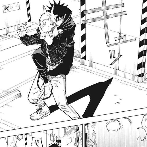 三年の秤金次の協力を得るため、伏黒はまずはパンダと立体駐車場の外で合流します。パンダは秤の居場所は分かっていて、立体駐車場の屋上にあるモニタールームに秤はいるそうです。しかしモニタールームには近づけないようで、モニタールームのドアに近づいても距離が縮まらないそうです。歩いても走ってもダメだそうで、感覚としては五条の術式・無下限呪術に近いそうです。
