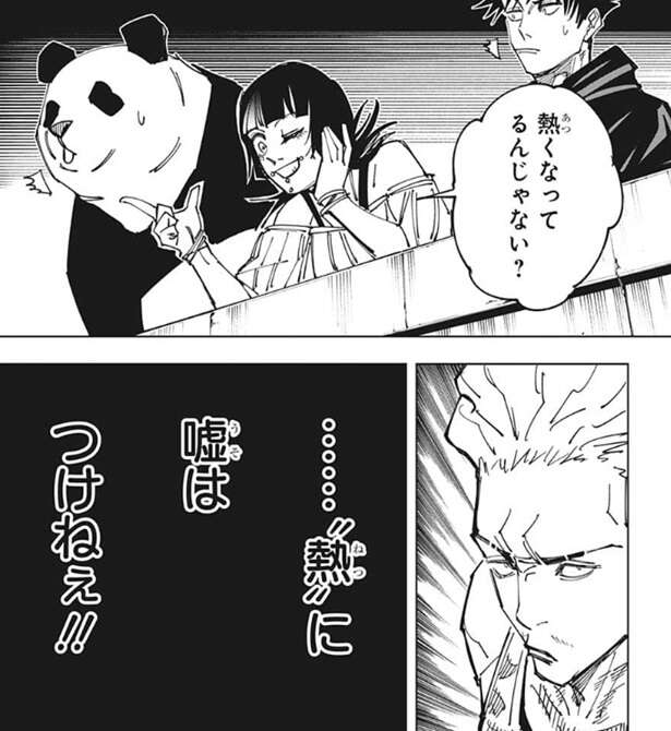 星綺羅羅に、熱くなってるんじゃない?と、言われ、図星だったのか秤はギクッとします。“熱”に嘘はつけねぇ!!と、秤は心のなかでつぶやくと、伏黒とパンダに降りてくるように言います。