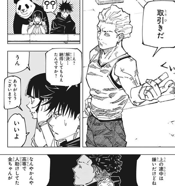 取引だと秤は言いますが、伏黒とパンダは意味が分からず、…え?解決…納得してもらえたんですか?と、伏黒は星綺羅羅に聞きますが、うん、と星綺羅羅は答えます。しかし、伏黒はあまり理解できていないようで、ありがとうございます?と、疑問形で感謝の言葉を口にします。上の連中は嫌いだけどね、なんやかんや高専で人助けしてた金ちゃんが一番熱かったから、と星綺羅羅は説明しますが、パンダは理解できず、うーん…?と、唸ってしまいます。