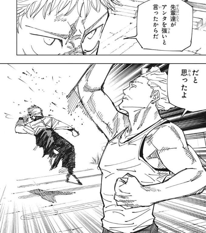 そして虎杖に、なんで俺だよ、俺達初対面だよな?なんで俺を頼る、と秤は質問します。虎杖は、先輩達がアンタを強いと言ったからだ、と答えると、再び秤は虎杖を殴りながら、だと思ったよ、と言います。秤に吹っ飛ばされながら虎杖は、なんだこの人の打撃は……!?威力の大小以前に“痛い”!!と、秤のパンチに驚きます。秤のパンチはヤスリのついたバッドで殴られたみたいに、痛いそうです。