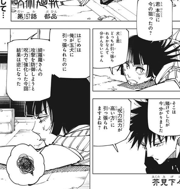 前回、伏黒は星綺羅羅の術式「星間飛行(ラヴランデヴー)」を解明し、星綺羅羅を拘束することに成功します。星綺羅羅は伏黒が本当に自分の術式を解明できていたのか、疑問に思い伏黒に聞きます。すると、伏黒は玉犬と自分どっちに引っ張られるかまでは分かっていなかったようですが、今回玉犬が伏黒の方に引っ張られる現象を見て“呪力出力が高い方” に引っ張られるという事に確信を持ったようです。