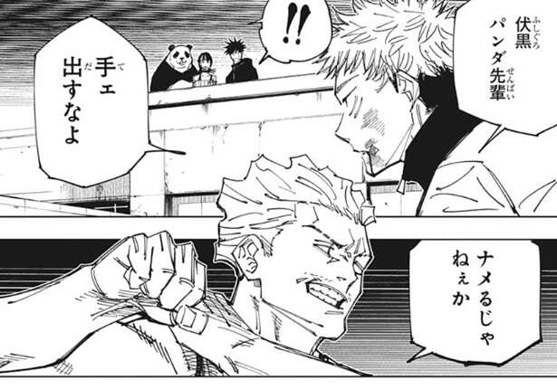 虎杖は怒った秤に殴られて吹っ飛ばされたようで、まだ怒りが収まらない様子の秤が部屋から出てきます。虎杖は伏黒とパンダに手を出さないように言いますが、秤は、ナメるじゃねぇか、と言うと、さらに虎杖を殴ります。