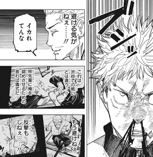盛大に鼻血を出す虎杖ですが、これは渋谷での真人との戦いとは違う、秤に自分を認めさせる儀式だと自分に言い聞かせ、避けも反撃もしないと虎杖は決心します。秤が折れるまで攻撃を受け続けると誓う虎杖に、秤はオマエが立ってる間は話を聞いてやると虎杖に言います。