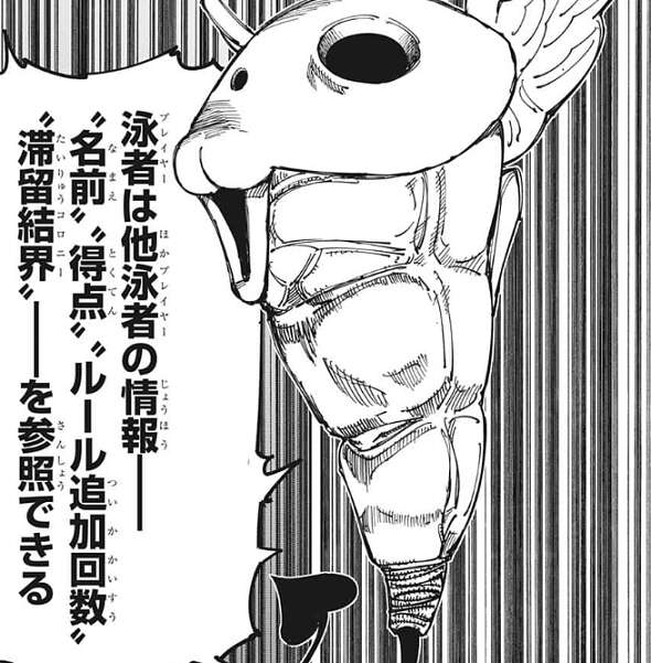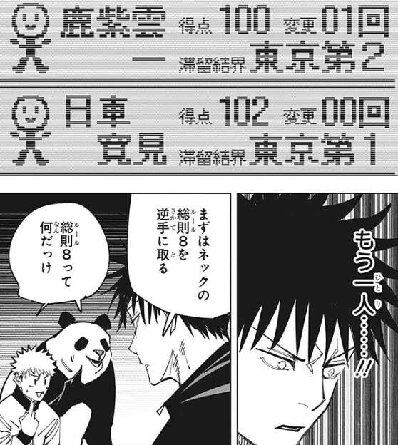そして、コガネは鹿紫雲一と日車寛見という二人の人物をリストアップします。この情報を見て、まずは総則8を逆手に取る、と伏黒は言います。総則8とは「参加またはポイント取得後、一九日以内にポイントの変動が見られない場合、そのプレイヤーからは術式を剥奪する」というものです。術式を剥奪されるとそのプレイヤーは死亡してしまうので、プレイヤーは他のプレイヤーを殺してポイントを奪わないといけません。