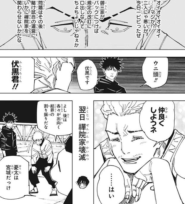 伏黒が禪院家当主と知り、秤は平静を装いつつも今日一ビビります。御三家がバックにつけば規定の改定に口出しはちょちょいじゃねぇか、と考え、伏黒への態度を一変、仲良くしようネ、と笑顔で伏黒に話しかけます。しかし、伏黒も秤もこの時は想像もしていませんが、翌日禪院家は真希によって壊滅させられ、秤の思惑は完全に外れてしまいます。