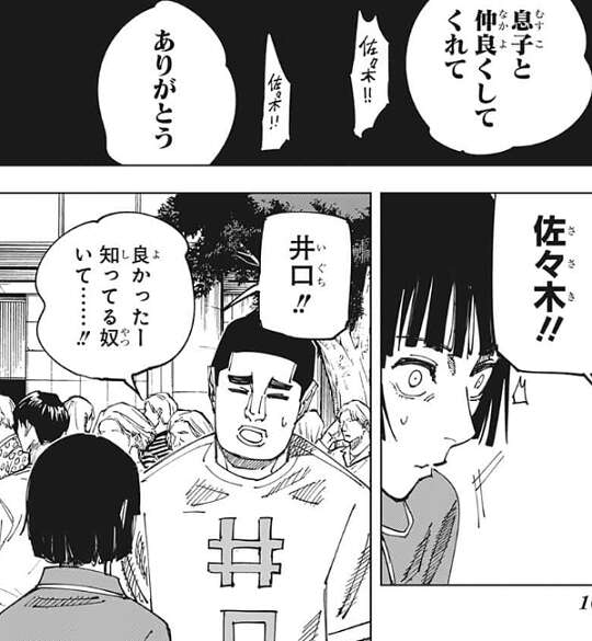 羂索が佐々木を結界の外に連れ出す直前、そうだ、言い忘れる所だった、と羂索は言い、息子と仲良くしてくれてありがとう、と羂索は佐々木にお礼を言います。そして、次の瞬間、佐々木は井口に呼びかけられて目を覚まします。場所は井口いわく、勾当台と広瀬通りの間くらいの場所らしいですが、目の前には黒い結界が広がっています。ちなみに井口とは、1話で出てきたオカルト研究会2年の男子の事です。