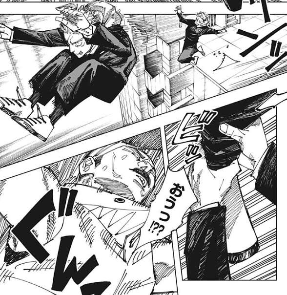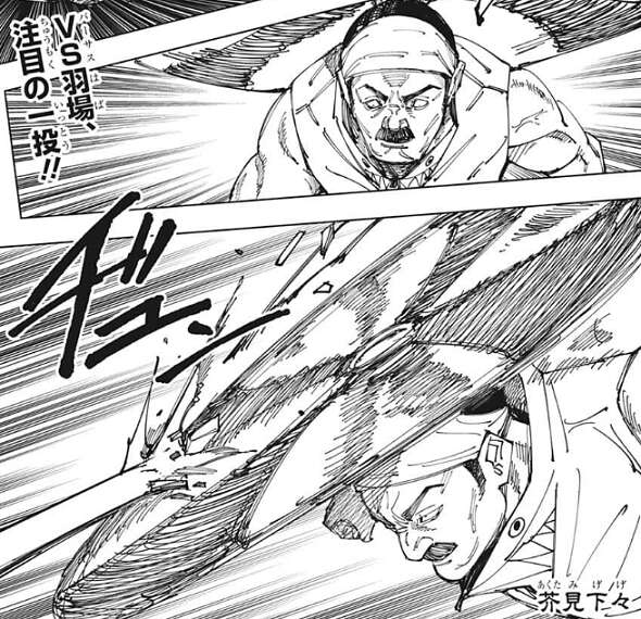 虎杖は羽場に対して、石を投擲して攻撃しようとしますが、プロペラの羽で防がれてしまいます。