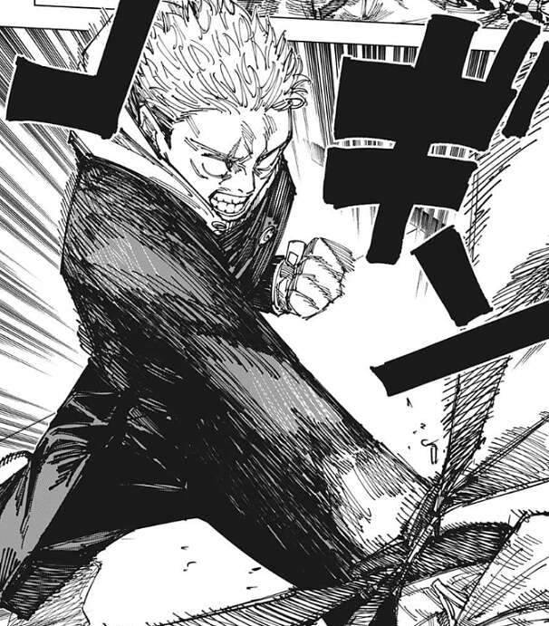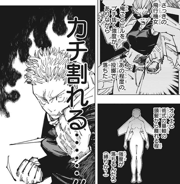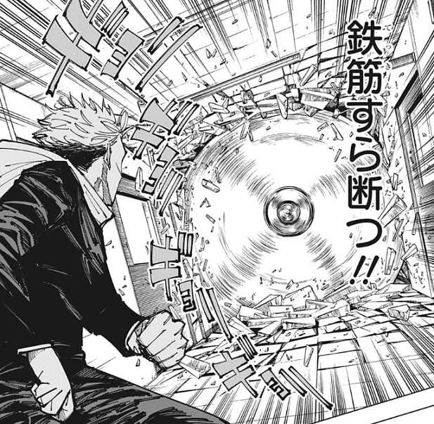 回転数と強度を上げた羽場のプロペラはビルの鉄筋すら粉砕していき、虎杖をスムージーにしてやる、と羽場は言いながら虎杖に迫ります。しかし、虎杖は冷静に、こっちに向けたな!!頭頂部(テッペン)!!と、心の中でつぶやきます。