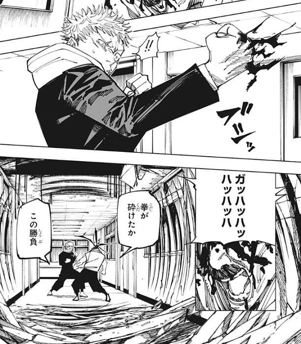 羽場はプロペラを止められ、頭から出血もしていますが、虎杖の拳からも出血しているのを見て、拳を砕いたと思い込みます。そして羽場は、この勝負おどれの負けじゃあ!!と、叫ぶと虎杖に勝利宣言します。