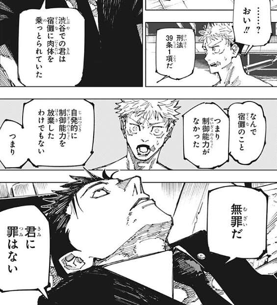 虎杖は急に日車が戦う意思を失くしたことに混乱しますが、渋谷での虎杖は宿儺に肉体を乗っ取られていた、つまり制御能力がなかった、と日車は言うと、無罪だ、君に罪はない、と虎杖に断言します。