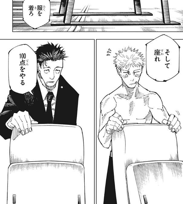それでも虎杖は自分のせいだと言い、自分が弱いせいだ、と自分自身を責めます。そんな虎杖に日車は少し心が救われたのか、椅子に座るように言います。そして、自分の持つポイント、100点を譲渡すると虎杖に話しかけます。
