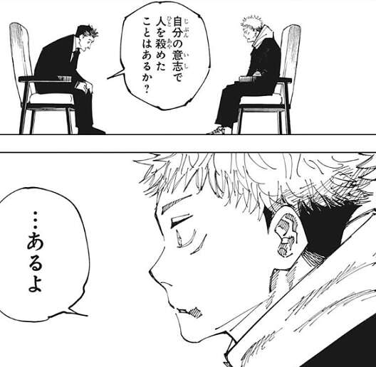 虎杖が椅子に座って上着を着ていると、自分の意思で人を殺めたことはあるか?と、日車は虎杖に問いかけます。虎杖は、…あるよ、と答えます。