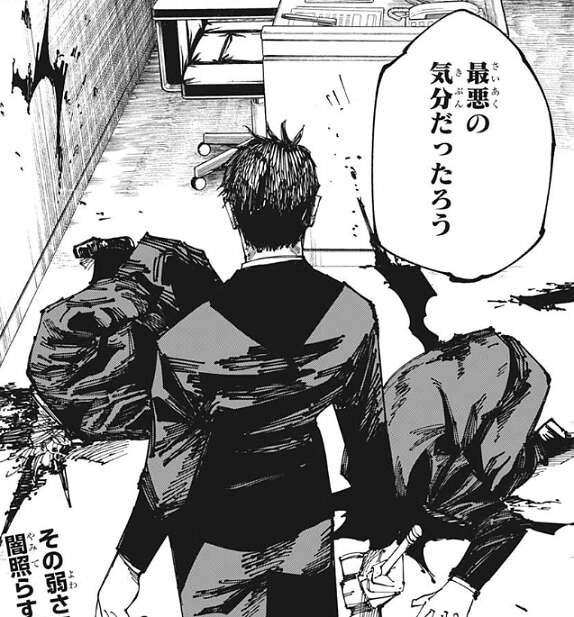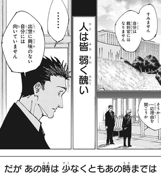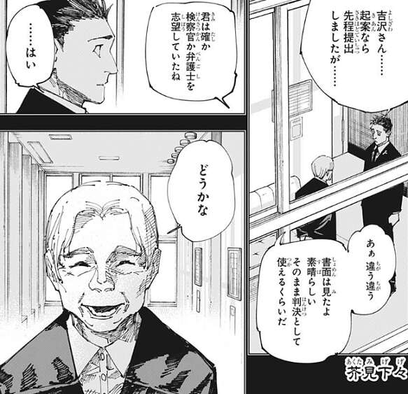 虎杖の答えを聞いた日車は、裁判所で自分が殺した裁判官と検事を思い出しながら、最悪の気分だったろう、とつぶやきます。