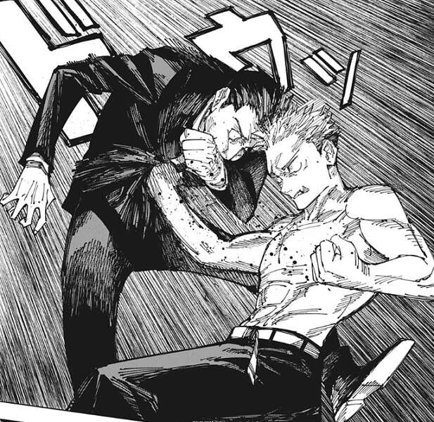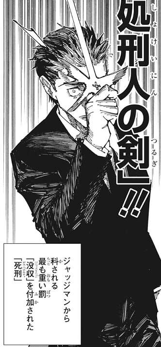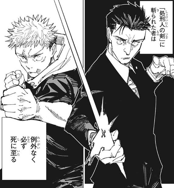 しかし、日車は虎杖の動きを呼んでいたのか虎杖の手をかわすと、「処刑人の剣」で虎杖に斬りかかり、虎杖も日車に殴りかかろうとします。