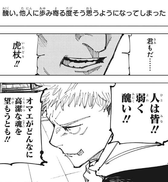 そして、日車は他人に歩み寄る度に他人の弱さを醜い、と思うようになってしまっていました。日車は虎杖に、人は皆!!弱く醜い!!オマエがどんなに高潔な魂を望もうとも!!と、叫びます。