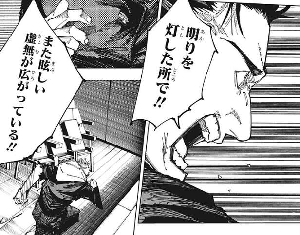 さらに、その先には何もない!目の前の闇はただの闇だ!!明りを灯した所で!!また眩しい虚無が広がっている!!と、日車は自分の想いを虎杖に叫びます。虎杖は日車が叫んでいる隙に、椅子を掴んで何個も日車に対して投げつけます。
