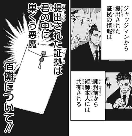 そして日車は虎杖に、何故罪を認めた……!!と、心の中で問いかけます。ここで、ジャッジマンから提出された証拠の情報は、実は開封前から日車には共有されていたことが明かされます。つまり日車は宿儺の事を知っていて、宿儺が渋谷での大量殺人を行い、虎杖は大量殺人を犯していないことを分かっていました。