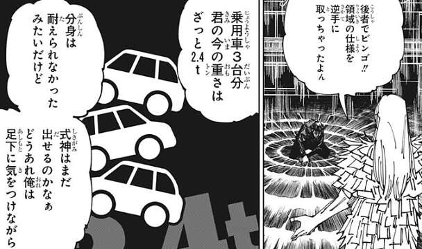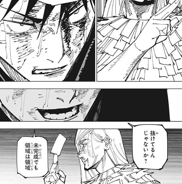 レジィは、君が自重で潰れるまで、重さを足し続ける、と伏黒に言い放つとレシートをからさらに何かを再現しようとします。しかし伏黒は口元に笑みを浮かべると、抜けてるんじゃないか?未完成でも領域は領域、と言い領域の天井の影を指さします。