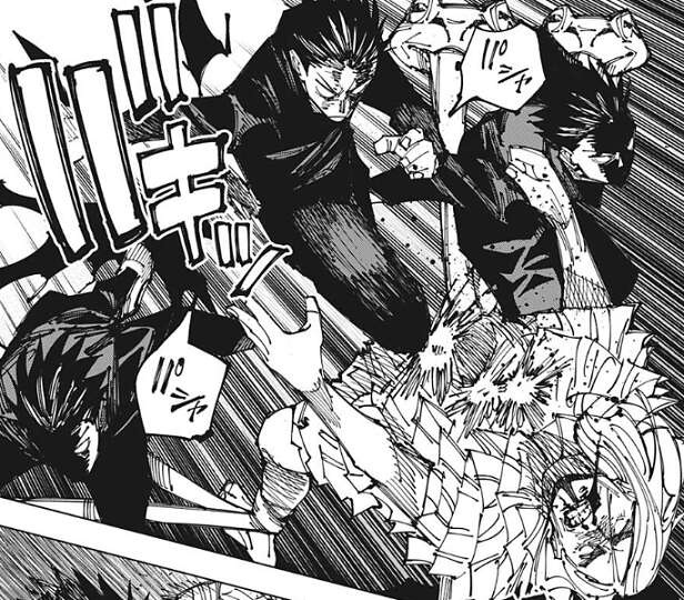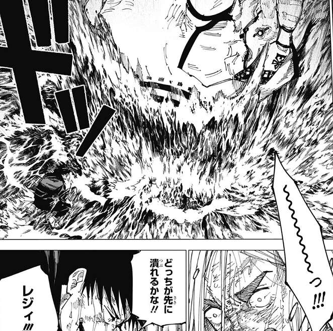 伏黒の領域が未完成と知らないレジィにとっては虚を突かれた形となり、薄ら笑いが消えてるぞ、と伏黒が言うとレジィは激怒して言い返そうとしますが、言い返している途中で影から出てきた式神や伏黒の分身による連続攻撃がレジィを襲います。