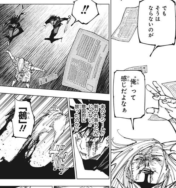 レジィは、伏黒の領域による術式性能の上昇が半端でなく、このまま領域で満象を出されて水責めで畳みかけられたら、レジィの手数は半減し敗色濃厚と考えます。しかし、そうはならないのが“俺”って感じだよなぁ、とレジィはつぶやくと、レシートを空中に何枚か投げます。伏黒はすぐにレジィが何かレシートで再現しようとしていると気付き、鵺でレシートを使用不可にしようとします。