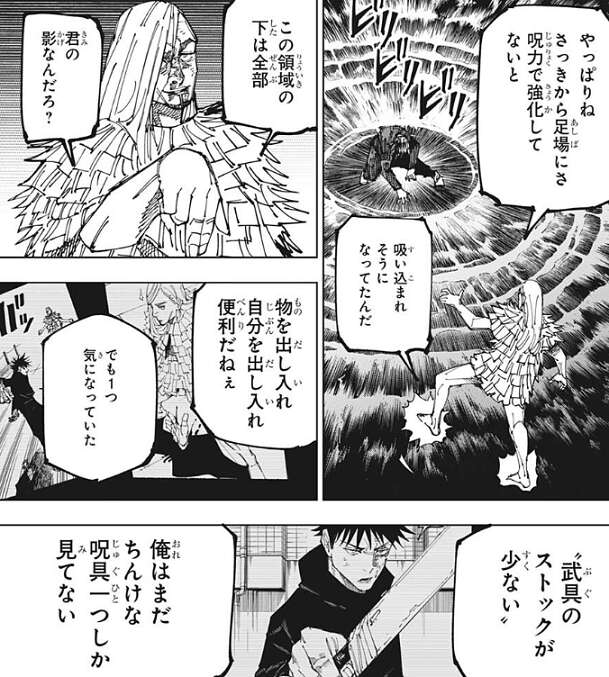 しかし、鵺がレシートにたどり着く前にレシートは乗用車3台を再現します。乗用車3台はそのまま伏黒の領域の影に吸い込まれていくと、伏黒はその場に身をかがめた形になります。レジィは伏黒の領域の仕様に気付いたようで、影に物を出し入れしたり、自分を出し入れしたり便利だね、でも1つ気になっていた、とレジィは言います。“武具のストックが少ない”、俺はまだちんけな呪具一つしか見ていない、とレジィは指摘します。