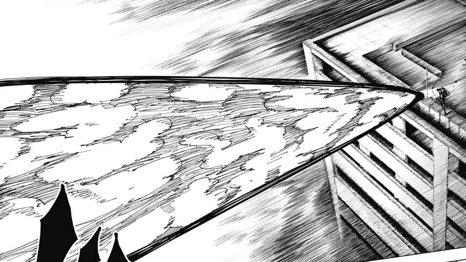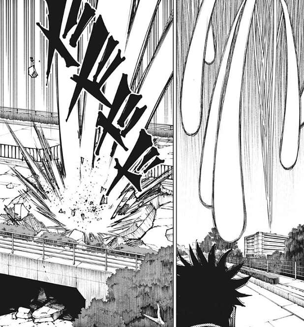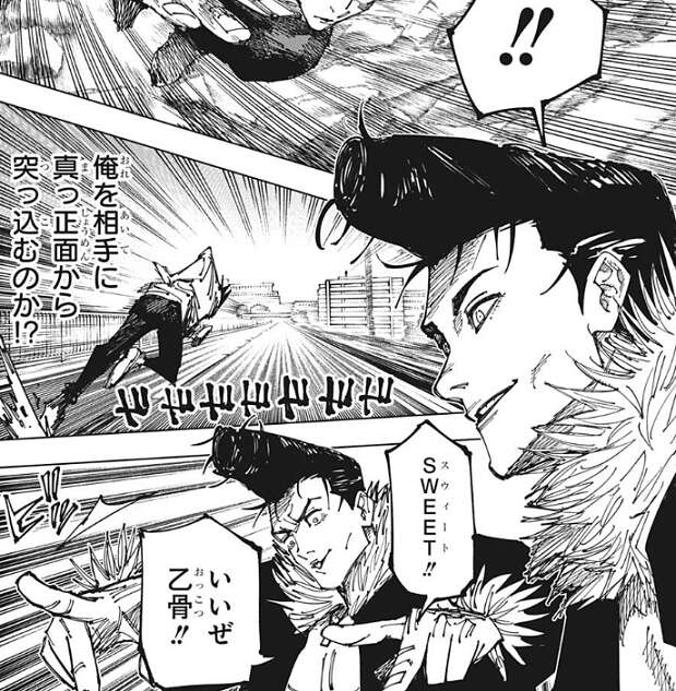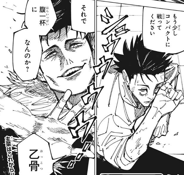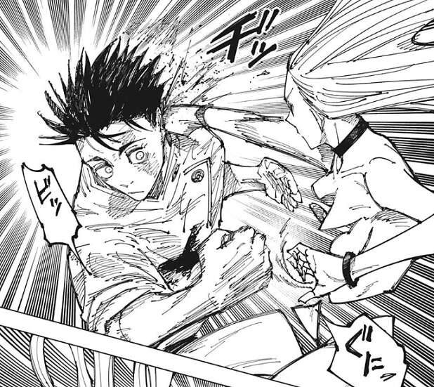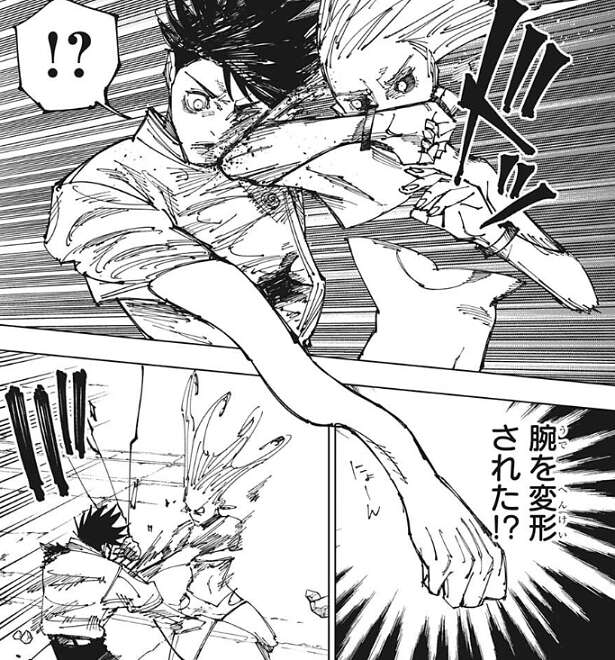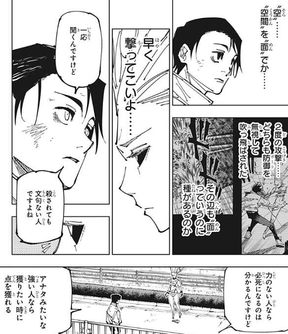 乙骨も反撃しようとしますが、再び烏鷺が空間を歪めると今度は乙骨の腕が変形してしまいます。再び乙骨は吹っ飛ばされますが、今度は乙骨も攻撃をガードして最小限のダメージにします。地面に着地した後、乙骨は自身の腕を見ると、腕は戻っていて異常はありません。乙骨は烏鷺の術式を、多分空間をイジる術式で空間ごと相手を潰したりは出来ないようなもの?と、数即死ます。