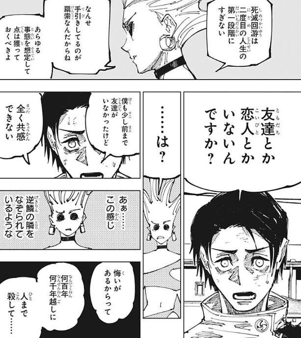 乙骨が攻撃してこずに質問したのが、烏鷺には癇に障ったようで、質問に答えながらも烏鷺は徐々に機嫌が悪くなっていきます。烏鷺にとっては黄泉返りで二度目の人生で、この死滅回游は二度目の人生の第一段階にすぎず、あらゆる事態を想定して点は獲っておきたい、と乙骨に言います。