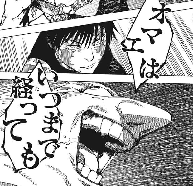 直哉は一撃で決められなかった真希に襲い掛かろうとし、人間の姿から呪霊の姿へと変化し始めます。領域展開の効果でもう真希は身動きが取れないと思い、直哉は勝利を確信したのか、真希を馬鹿にしたように煽ります。