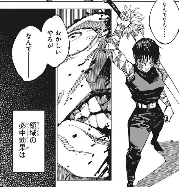 直哉はおかしいとつぶやきますが、直哉の領域の必中効果は呪力のない真希を認識できないようで、真希に領域展開の効果が及ぶこともありませんでした。そして直哉が倒されると、直哉の領域は崩壊し、真希・大道・三代は領域の外に開放されます。